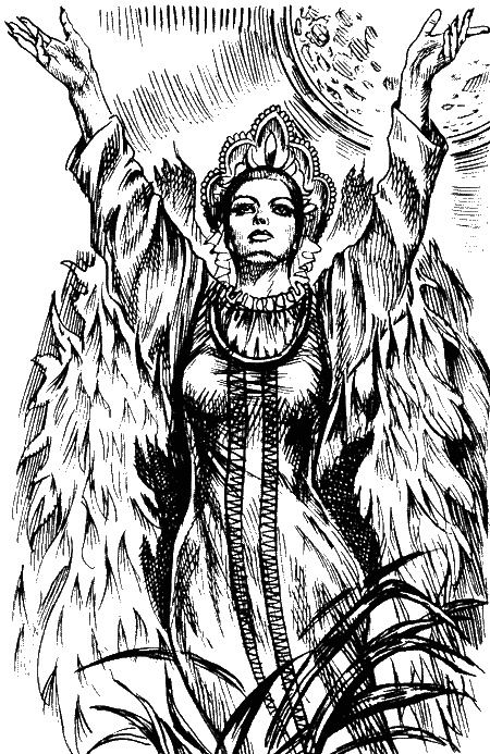 Некоторое время пламя отличалось от обычного только тем, что имело зеленый цвет и горело неизвестно откуда. Однако уже через несколько минут пламя стало изменять форму. Если вначале оно представляло собой один длинный, продолговатый и остроконечный язык, похожий на сильно увеличенный огонек свечи, то по прошествии помянутых минут верхняя часть разделилась натрое, а нижняя заметно расширилась. Затем два боковых языка сильно удлинились, вытянулись и стали похожи на рукава какого-то старинного платья. А средний язык стал похож сперва на карточного пикового туза, а потом на голову женщины в остроконечном кокошнике. Одновременно пламя постепенно блекло, теряло свой ядовито-зеленый цвет и все больше переставало походить на огонь. Еще несколько секунд прошло — и пламя превратилось в струящийся поток полупрозрачного белесого тумана, который к этому моменту явно принял очертания женщины, одетой в длинный старинный сарафан до пят и воздевшей руки к небу. Даже черты лица можно было разглядеть под кокошником — правда, пока еще расплывчатые.