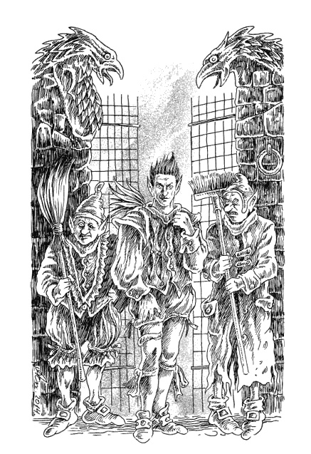 Из-за величественного кресла, обитого бордовой парчой, навстречу Броку и Финоле вышли три кобольда и преградили им путь. Какое-то время замковые кобольды молча смотрели на гостей, и наконец самый высокий из них заговорил.