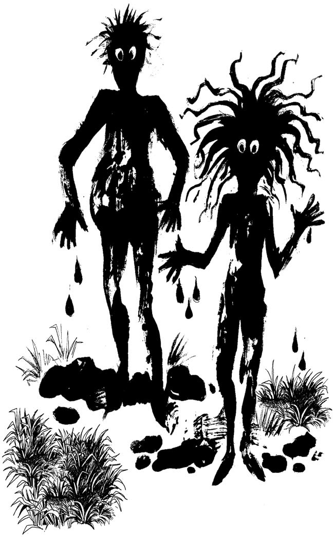 Существа подошли совсем близко. Теперь можно было рассмотреть, что посреди их измазанных физиономий блестят вполне живые человеческие глаза. А на голове меньшего никакие не змеи, а слипшиеся волосы, пропитанные жидкой смесью глины и земли.