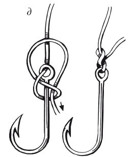 Рисунок 23 (продолжение). Рыбацкие узлы для прикрепления лески к крючку: б) усиленный стивидорный; в) двойной стивидорный; г) акулий; д) канадская восьмерка