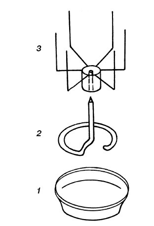 1 – стеклянная миска; 2 – вертел, вставляемый в миску; 3 – мультивертел, надеваемый на вертел