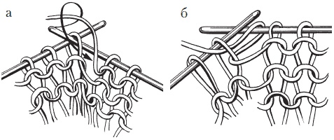 При первом, классическом, способе надо снять кромочную петлю, рабочую нить перекинуть на левую спицу. Ввести в первую петлю правую спицу справа налево, захватить рабочую нить и протянуть ее сквозь петлю. Рабочая нить, лежащая на указательном пальце, как бы обвивает при этом снизу вверх правую спицу (рис. 30 а). Новую петлю перекинуть на правую спицу, а провязанную сбросить с левой спицы (рис. 30 б). Эта петля лицевая, выполненная классическим способом.