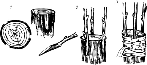 Рис. 57. Обыкновенная прививка за кору: 1) срез на черенке; 2) прилаженный черенок; 3) обвязка