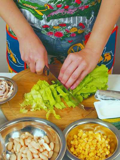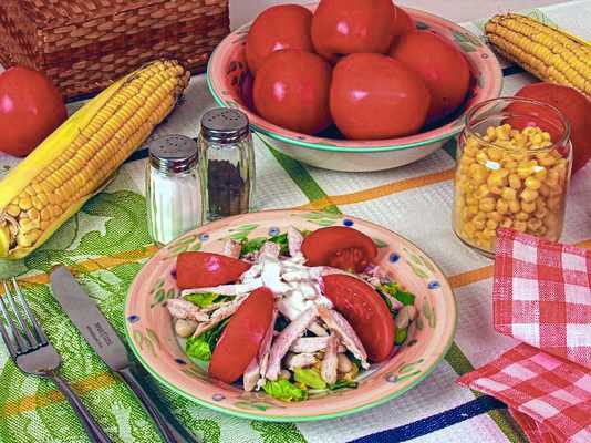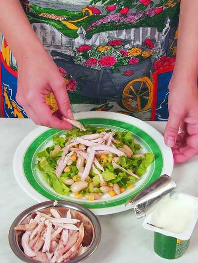 50–60 г куриной грудки, 50 г консервированной желтой фасоли, 50 г консервированной кукурузы, 1/2 помидора, 2 ст. ложки растительного масла, 2 ст. ложки йогурта, 1/2 пучка салата, соль.