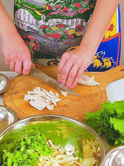 Обжаренное мясо курицы нарезать некрупной соломкой.