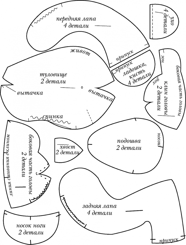 Разложите детали выкройки на ткани, обведите их маркером и вырежьте: голова — 2 детали, передние лапы — 4 детали, задние лапы со сгибом — 2 детали, подошвы — 2 детали, туловище со сгибом — 2 детали, ухо — 4 детали (рис. 24).