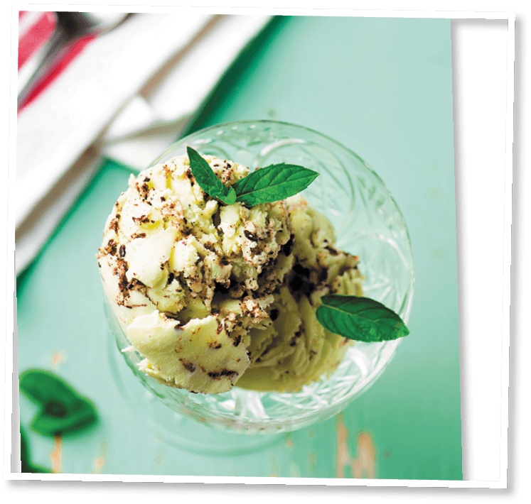2. В яично-сливочный крем влить мятный сироп, перемешать. Вылить массу в мороженицу и включить прибор. Когда мороженое начнет подмораживаться по краям и густеть, добавить тонкой струйкой растопленный шоколад. Образуются тонкие шоколадные прожилки. Остановить мороженицу и убрать контейнер с мороженым в морозилку на 4–5 часов.