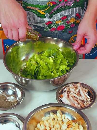 Пшеничные сухарики и обжаренное куриное филе выложить поверх нарезанных листьев салата.