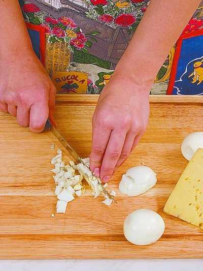Мелко нарезанный желток и измельченный сыр поместить в салатницу следующим слоем.