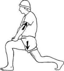 Кроме того, выпрямляя туловище, как показано на следующих двух рисунках, вы можете растягивать область таза. Начните с выставления вперед одной ноги таким образом, чтобы ее голеностоп оказался прямо под коленом. Колено другой ноги свободно опирается на пол. Ладони рук сложите на бедре чуть выше колена. Чтобы растянуть переднюю часть таза и бедра, выпрямите руки для удержания туловища в вертикальном положении и одновременно опустите вниз таз. Это великолепная растяжка для передней части тазобедренного пояса, которая, к тому же, полезна для поясницы. Держите 10–15 секунд. Повторите то же самое для другой стороны.