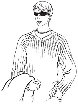 Перед. На спицы № 1,5 наберите 170 петель и вяжите резинкой 6 см. Перейдите на спицы № 2, равномерно прибавив в 1-м лицевом ряду 10 петель. Петли распределите следующим образом: 21 петля лицевой глади, 32 петли узора «Ромбы», 22 петли клеток, 32 петли ромбов, 22 петли клеток, 32 петли ромбов и 21 петля лицевой глади. Вяжите 44 см. Затем выполните проймы, как на спинке. На высоте 52 см от наборного края выполните V-образный вырез горловины. Для этого закройте средние 2 петли и обе стороны закончите раздельно. Для закругления выреза убавляйте с обеих сторон в каждом 2-м ряду по 1 петле. На высоте 72 см от наборного края закройте оставшиеся 50 петель плеча.