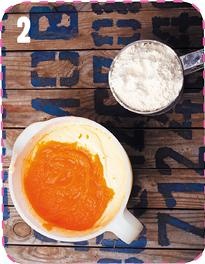 2. Влить растительное масло и тыквенное пюре, перемешать. В три приема ввести просеянную с разрыхлителем и щепоткой соли муку вперемешку с молоком. Тщательно вымесить тесто лопаткой.