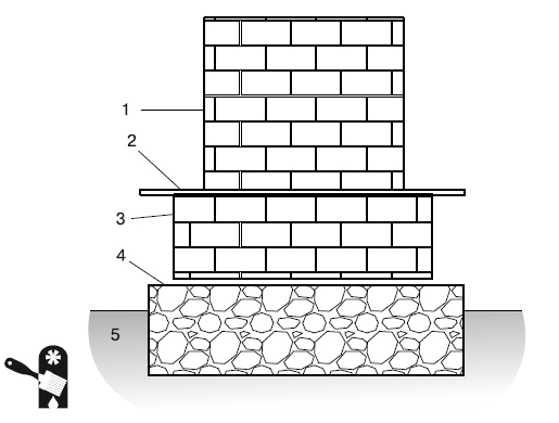 Рис. 6.3. Сплошной фундамент (бутобетонный): 1 — печь; 2 — уровень пола, гидроизоляция; 3 — кирпичная кладка или бетонная заливка; 4 — бутовый камень, щебенка, гравий; 5 — грунт