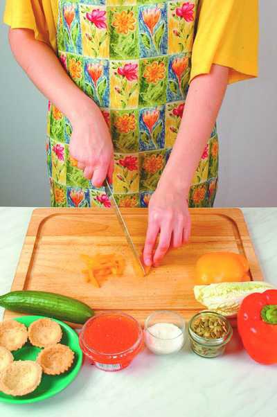 2 средних огурца, 1 крупный болгарский перец, 6 листьев пекинской капусты, 50 г очищенных тыквенных семечек, 80 г красной икры, 1 ст. ложка растительного масла, 6 тарталеток, несколько веточек укропа, соль и перец по вкусу.