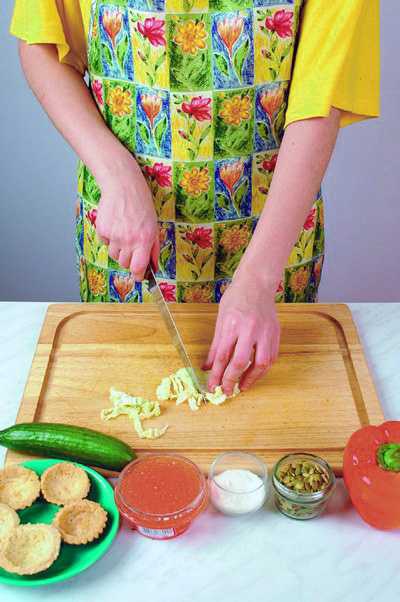 Каждую тарталетку наполняют фаршем и красной икрой.