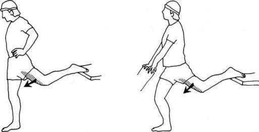 Отведите одну ногу назад, опираясь ступней на стол, забор или перекладину, расположенную на подходящей высоте. Попробуйте подтянуть ногу от бедра (вперед), чтобы создать напряжение в передней части таза и в четырехглавой мышце. Выполняя движение, разворачивайте мышцы ягодиц. Опорную ногу слегка согните в колене (на 2–3 см), тело держите прямо. Ступня опорной ноги должна смотреть прямо вперед. Можно изменить нагрузку, согнув опорную ногу немного больше. Удерживайте легкую растяжку 10–15 секунд. Научившись расслабляться при выполнении этого упражнения, вы улучшите координацию и будете чувствовать себя достаточно комфортно. Дышите. При необходимости используйте для удержания равновесия стул или что-то в этом роде.