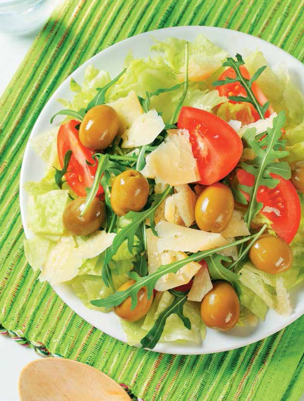 • На широкую тарелку выложить листья латука, сверху разложить дольки помидора, сыр, присыпать рукколой и добавить оливки.