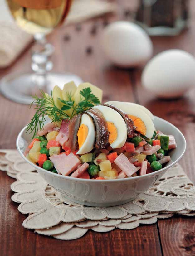 • Ветчину нарезать на крупные кубики, маринованные огурцы, картофель и морковь – на мелкие. Яйца очистить, половинку яйца отложить для украшения, оставшиеся мелко нарубить.