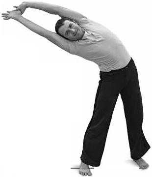 При наклоне тело должно находиться в одной плоскости. Не разворачивайте таз или корпус (представьте, что вы находитесь между двумя стенами). Чтобы научиться выполнять это упраж не ние в одной плоскости, можете сначала потренироваться, прижавшись спиной к стене. Наклонившись в сторону, вытяните рукой, которая находится ниже, руку, которая выше (большим пальцем правой руки за большой палец левой руки). На вдохе немного приподнимитесь, а на следующем еще больше наклонитесь. Сделайте 2-3 таких движения. Помните, перенапряжения быть не должно! Поднимайтесь на вдохе, вытягивая руки вверх и потягиваясь. На очередном выдохе наклонитесь влево. Несколько небольших наклонов влево, вернитесь на вдохе в вертикальное положение, руки вверху, потянитесь и на выдохе опустите руки через стороны вниз. Задержитесь в устойчивом положении (основная стойка), почувствуйте изменения в теле, расслабьтесь, сделайте несколько глубоких дыхательных циклов.