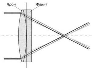 Однако хроматическая аберрация (см. рисунок 2) не смогла уничтожить телескоп на основе линз. Около 1730 года английский адвокат и ученый-любитель Честер Мур Холл предложил новый подход, в котором комбинировал линзы разной формы из разных материалов (см. рисунок 3). Например, угол преломления света, проходящего через стекло крон, будет отличаться от угла при переходе через стекло флинт.