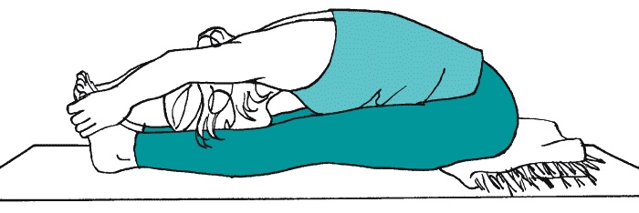 Вариация для этапов 1 и 2Б с блоком. После родов – когда закончатся выделения – практикуйте джану ширшасану, положив пятку вытянутой ноги на блок. Это помогает укрепить позвоночник и восстановить тонус матки. Для начала сядьте на коврик в позу посоха. Положите левую пятку на блок, а правое колено согните и отведите в сторону. Подтяните правую стопу к промежности так, чтобы она касалась внутренней стороны левого бедра. Этап 1 – с прямой спиной: сделайте вдох и поднимите руки над головой, ладонями друг к другу; выпрямите локти и потянитесь вверх, удлиняя пальцы; наклонитесь вперед и обхватите руками левую ступню; выпрямите спину и вытяните позвоночник; смотрите вверх. Этап 2Б – с опущенной головой: не сгибая левую ногу в колене, подайте корпус вперед и опустите лоб на левую голень; положите грудную клетку и живот на левое бедро; вытяните позвоночник – от копчика до подмышек.