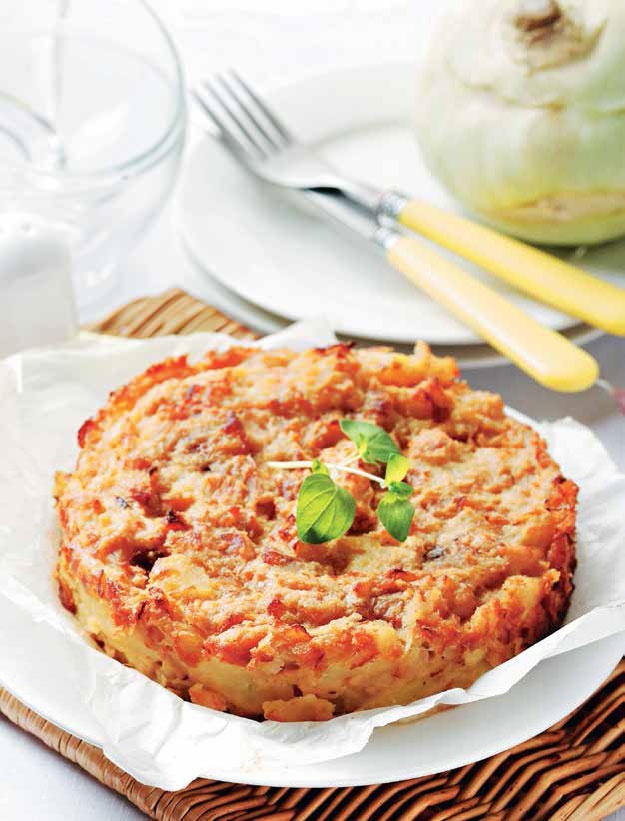 • Форму для запекания смазать маслом. На дно уложить картофель, кольраби и брынзу. Залить молочно-яичной смесью, посыпать тёртым сыром.