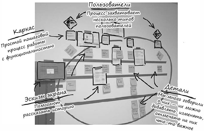 Чтобы внедрить новую функциональность, Майку и Аарону нужно было, чтобы у них и команды выработалось общее мнение о ней. Ребятам из их команды нужно было осознать проблему и возможности для улучшения, а также оценить, сколько времени займет реализация решения. Для этого Майк с Аароном и создали окончательный вариант карты. С ее помощью они изложили историю функциональности шаг за шагом с точки зрения пользователя. Вы заметили, что на карте присутствуют распечатки экранов? При построении карты ее авторы использовали экраны, отмечая на них детали по мере продвижения, чтобы при ознакомлении с историей легче было понять решение. Именно так поступают сотрудники компании Disney, когда излагают сценарий мультфильма с помощью раскадровок.