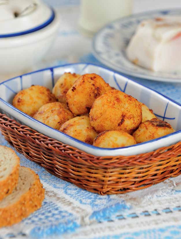 • Шкварки и лук переложить в картофельную массу, перемешать, сформировать из массы небольшие шарики. Разогреть в сковороде половину растительного масла, обжарить картофельные шарики до золотистого цвета.
