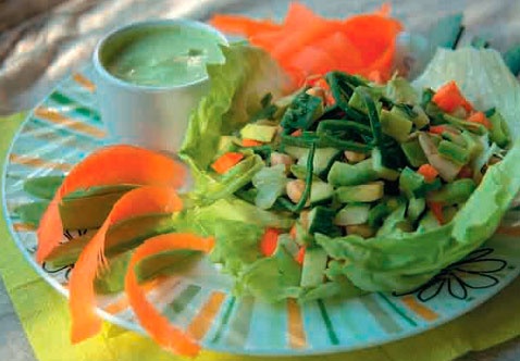 Салат. Нарезаем все ингредиенты кубиками, заправляем зеленью и льняным майонезом. Выкладываем на листья салата Айсберг.