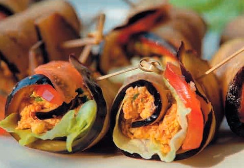 Если доработать начинку, получится полноценное второе блюдо. Для начинки измельчаем грецкий орех, натираем на мелкой терке морковь. Добавляем специи, зелень и соль. Выкладываем лист салата Айсберг на ломтик баклажана, сверху кладем начинку. Закручиваем баклажан в рулетик и закрепляем шпажкой.