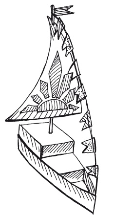 Из цветной бумаги вырежьте треугольный парус, высота которого на 3–5 см больше длины мачты. Украсьте парус рисунком. Выполните отверстия в парусе дыроколом и нанижите его на мачту. Согните лист цветной бумаги пополам и вырежьте из него двойные флажки. Можно их сделать из бумаги разного цвета. Один флажок приклейте к верхушке мачты.