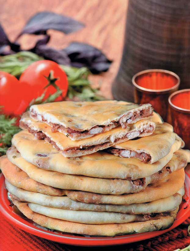 • Готовое тесто разделить на 5 частей, каждую из которых раскатать в круглую лепёшку. На середину лепёшки положить начинку из фасоли. Затем края лепёшки собрать в центре, защипнуть и раскатать лепёшку повторно. Толщина лепёшки не должна превышать 1 см. Верхний слой теста в нескольких местах проткнуть вилкой. Обжарить лепёшки на сковороде, смазанной жиром, с обеих сторон. Лепёшки можно обжаривать на сухой сковороде, а затем смазать сливочным маслом.