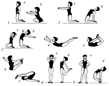 1. И.п. – стоя на коленях, руки на поясе (а). На выдохе сесть на пол слева от ног, вытянув руки вперед (б). На вдохе вернуться в и.п. Затем сесть вправо от ног. Повторить 6-10 раз. Темп средний.