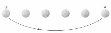 Фейнман рассуждал таким образом. Представим, что мы перемещаем атом из точки А в точку В на длинном расстоянии. Если новая конфигурация должна иметь единую плотность, тогда необходимо преобразование других атомов, и один атом должен перемещаться, чтобы занять оставшееся пустое место. Перемещая очень отдаленный атом, мы будем пытаться поверить, что выходящее состояние должно сильно отличаться от начального. Но об этом можно забыть, когда речь идет о бозонах: даже при взаимозаменяемости очень удаленных атомов гелия мы сохраняем такую же конфигурацию, так как в действительности мы обмениваем идентичные бозоны (рисунок 1). Только волновая функция будет изменена, если перемещение из А соответствует хотя бы половине средней дистанции между соседними частицами. В этом случае новая конфигурация будет отличаться от начальной (рисунок 2).