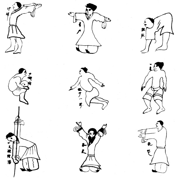 Рис. 4–8. Уциньси (игры пяти животных), имитирующие движения тигра, медведя, оленя, обезьяны и птицы