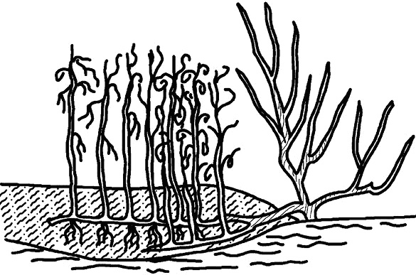 Побеги вскоре начнут расти. Подсыпайте в траншею почву по мере их отрастания. С наступлением осени отделите укорененный рукав от материнского растения и разрежьте на несколько частей, на каждом из которых должен остаться 1 побег (рис. 81).