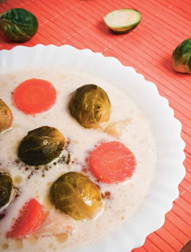 • Куриное мясо нарезать узкими полосками. Морковь очистить и нарезать кружочками, лук очистить, мелко нарезать. Кочанчики брюссельской капусты помыть, разрезать пополам.