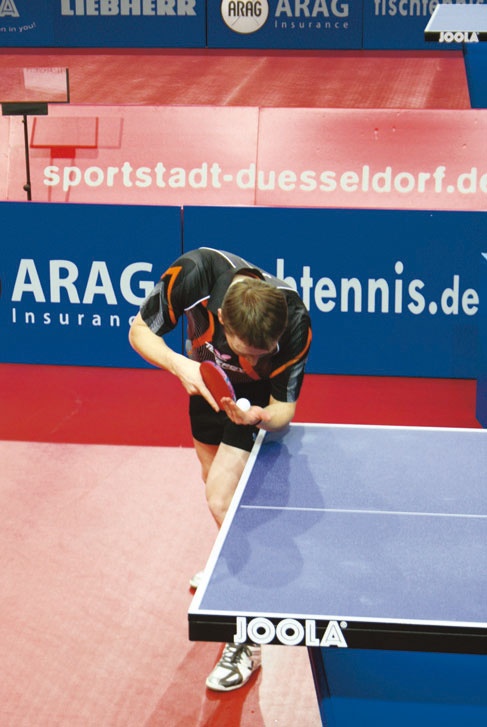 Основное положение: Вернер стоит вполоборота к столу. Одна нога выставлена вперед. Корпус наклонен, вес тела приходится на выставленную ногу. Вернер держит мяч прямо за задней линией стола (1). Рука по-прежнему внизу, в то время как корпус тела слегка поднимается (2). На фото 3 корпус все еще выпрямляется. Одновременно с этим Вернер слегка приподнимает правую ногу, чтобы отвести ее назад. Затем он вытягивает руку с шаром и одновременно передвигает ракетку назад и вверх. В тот момент, когда переводит мяч на уровень груди, он смещает вес тела на правую ногу (4 и 6) и приподнимается на носке левой ноги, как видно на фото 7. Его взгляд зафиксирован на мяче. В этот момент достигается предел его концентрации перед подачей. И теперь следует удар.