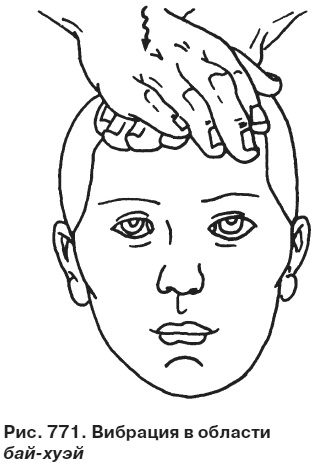 Основные предписания. Вибрация в области бай-хуэй (Т 20 — см. рис. 771), вибрация, производимая пальцем вдоль траектории ду-мери-диана (см. рис. 772), растирание точек в области живота (см. рис. 773), круговое растирание в области живота всей ладонью (см. рис. 774), круговое растирание в области шэнь-цюе (18 — см. рис. 775), легкие касания гениталий для укрепления ян почек (см. рис. 776).