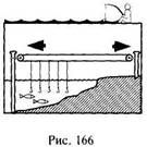 Для примера опишу ловушку, которая устраивается в небольшой заводи, широко заполняющейся водой во время прилива и почти полностью осушающейся во время отлива. Горловину такой заводи следует заложить камнями с таким расчетом, чтобы верх стены на несколько сантиметров был ниже уровня воды во время прилива. В заводь накидать побольше приманки – кусочков рыб, протомоллюсков и пр. для привлечения внимания рыб. Еще лучше устроить своеобразные ворота из горизонтальных и вертикальных жердин, которые по специальным, вбитым в дно направляющим можно будет опустить в момент начала отлива (рис. 169).