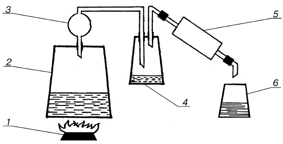 Данный прибор (рис. 7) позволяет очистить продукт от примесей и повысить концентрацию спирта до 70–80 % об. Главное отличие его от других перегонных устройств – наличие дополнительной емкости с водой (5). Действие прибора основано на пропускании паров смеси спирта и воды через водную среду с заданной температурой 80–82 °C, в результате чего водяные пары смеси конденсируются и остаются в емкости, а пары спирта проходят через холодильник (6), охлаждаются и конденсируются в холодильнике, далее собираются в сборнике (7).