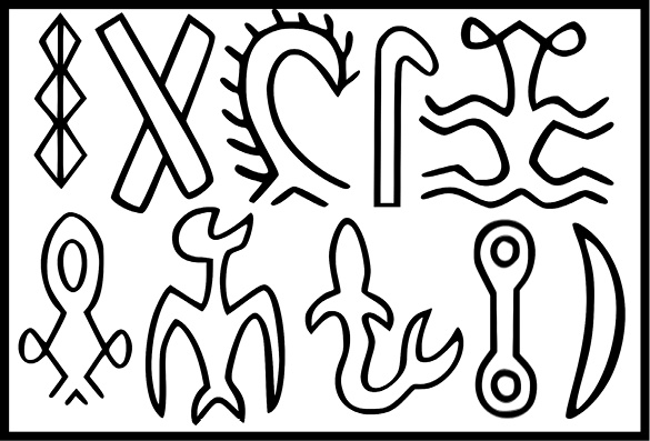 Письменность с острова Пасхи, именуемая «ронго-ронго», тоже никогда не была расшифрована. Это графический алфавит, содержащий стилизованные изображения животных, растений, людей и разные формы; его придумали рапануйцы, народ, населявший остров, и выглядит алфавит так (рис. 5).
