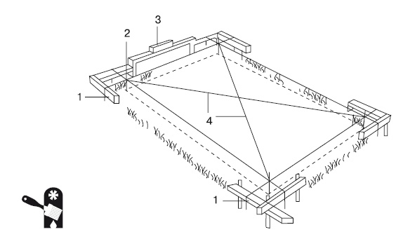 Рис. 2.1. Разметка площадки под фундамент: 1 — обноска из досок; 2 — отвес; 3 — уровень; 4 — шнур