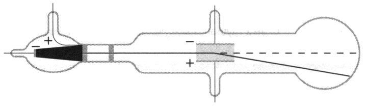 Катодные лучи (центральная линия) отклоняются из-за электрического поля (серый прямоугольник в центре).