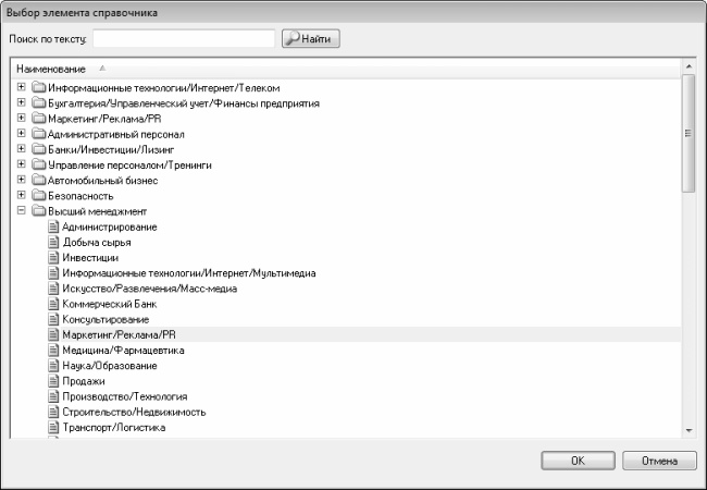 В данном окне нужно выбрать требуемую рубрику щелчком мыши (предварительно раскройте соответствующую ветвь иерархии) и нажать кнопку ОК. Для быстрого поиска рубрики используйте механизм поиска. В поле Поиск по тексту введите название или фрагмент названия рубрики (например, если вам нужно найти Бухгалтер, то достаточно ввести Бухгал, или даже Бухг), после чего нажмите кнопку Найти. В результате в списке останутся только рубрики, удовлетворяющие заданному условию. Чтобы вернуться к работе с полным списком рубрик, очистите поле Поиск по тексту и вновь нажмите кнопку Найти.