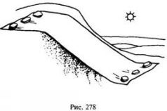 Простейший тент представляет из себя кусок ткани, наброшенный сверху на куст и подвязанный в нескольких местах к веткам (рис. 277). Можно растянуть тент над небольшой ямой-углублением в почве или наискосок, вдоль обрыва крутого бархана (рис. 278).
