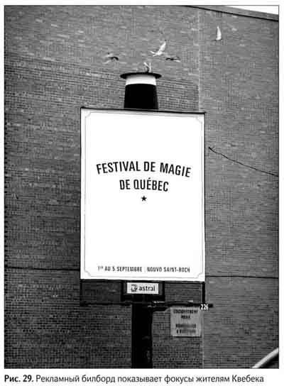 «В чем же волшебство?» — спросите вы. Чудес несколько. Во-первых, в рекламу были вовлечены городские птицы. Периодически из цилиндра вылетали стаи живых голубей (рис. 29).