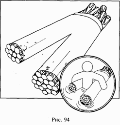 Еще более удобны для этих целей штаны. На набитых корой или камышом штанах удобно плыть, поместившись между штанинами (рис. 94).