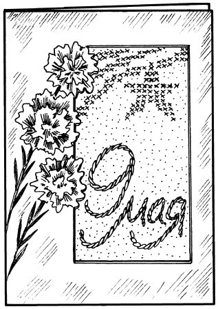 После того как клей высохнет, надо закрыть вышивку с обратной стороны листом бумаги. Для чего из листа белой бумаги вырезать прямоугольник размерами с половинку открытки. Края вышивки промазать клеем так, чтобы он не попал на нее, и приклеить приготовленную деталь (рис. 18).