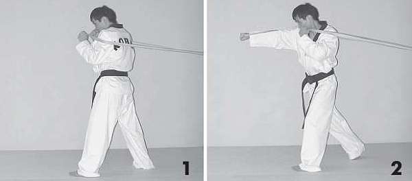 Техника выполнения: упражнение выполняется с использованием резинового жгута. Закрепите неподвижно резиновый жгут по середине длины. Возьмите два конца жгута в правую и левую руки, кисти сжаты в кулаки. Примите исходное положение – боевая стойка: спиной к закрепленному жгуту.